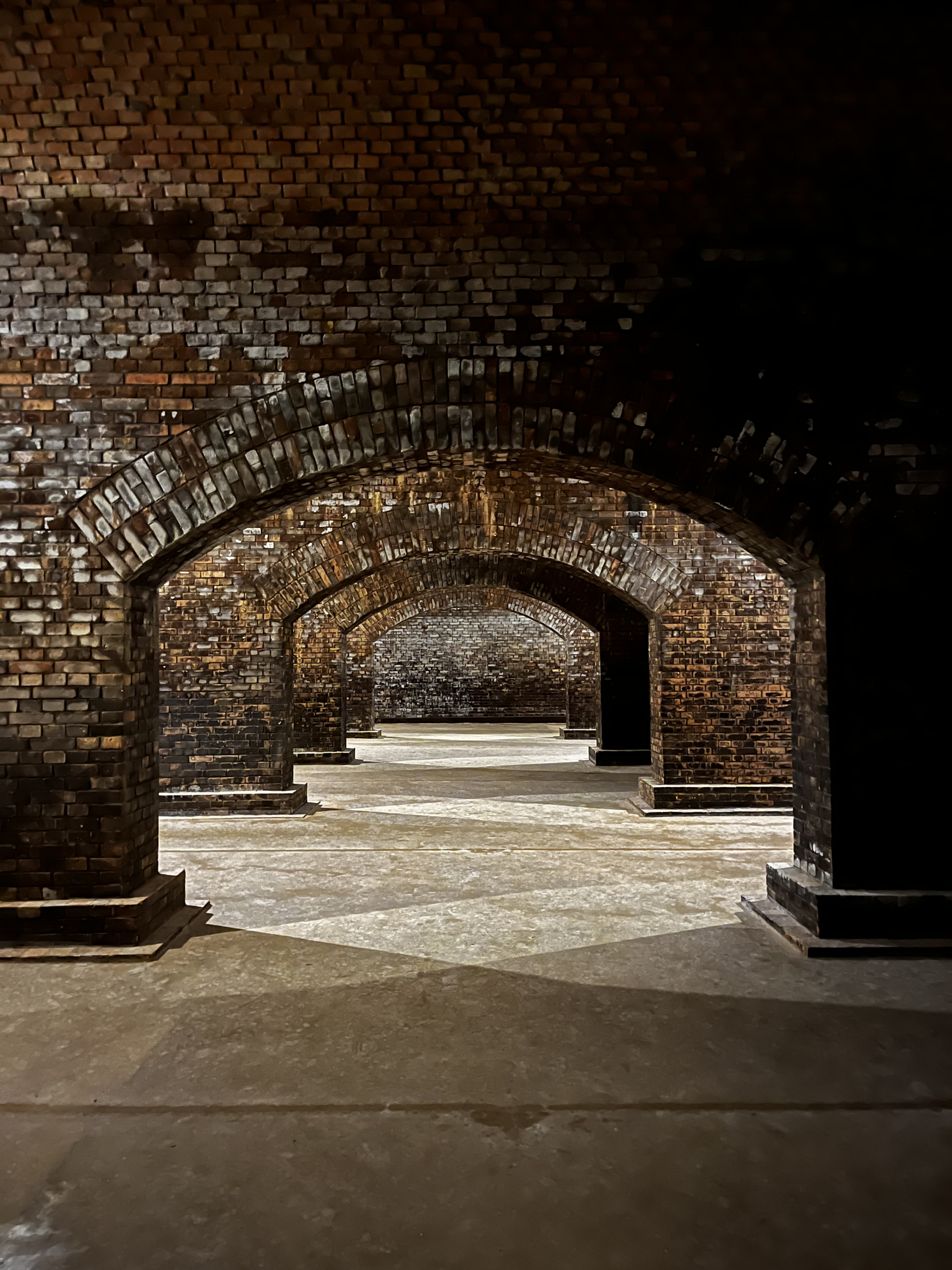 This horizontally aligned exhibition building, built of reinforced concrete and clad with a light grey roughcast, is a dynamic contrast to the tower building with its emphasis on material. Its asymmetrically designed architecture, with an entrance building with pavilion roof to the side and the southern staircase pavilion, is a counterbalance to the massive appearance of the towering clinker structure in the north. The large terrace above the staggered row of pergolas, formerly part of the once-open rose courtyard, is both an entrance for visitors and an inviting viewing platform. In accordance with Olbrich's designs, the cast concrete pillars spanning the entire structure and planted with vines and roses form a staggered transition between the rising terrain and the elevated Exhibition Hall.