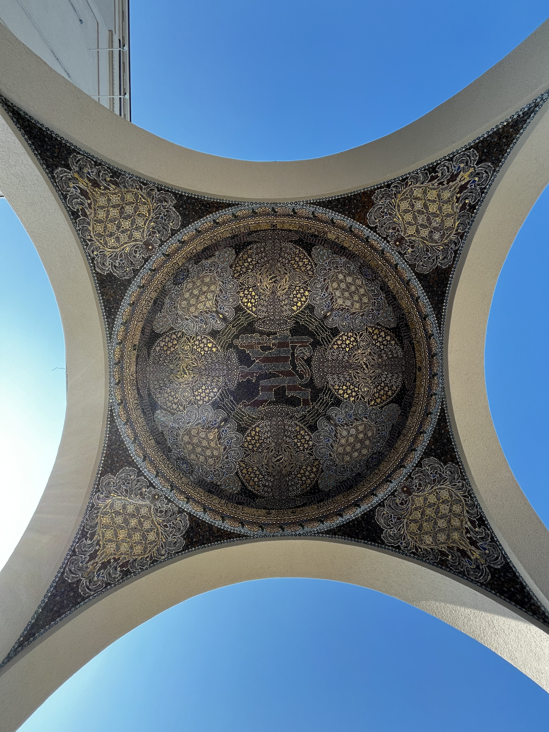 The staircase to the exhibition halls begins with a small platform flanked by a copper-roofed well house, also designed by Olbrich. Located on the first landing, the pavilion, supported by granite columns, offers a first view across the southern and western areas of the artists' colony. An artistically worked mosaic is accompanied by the inscription: