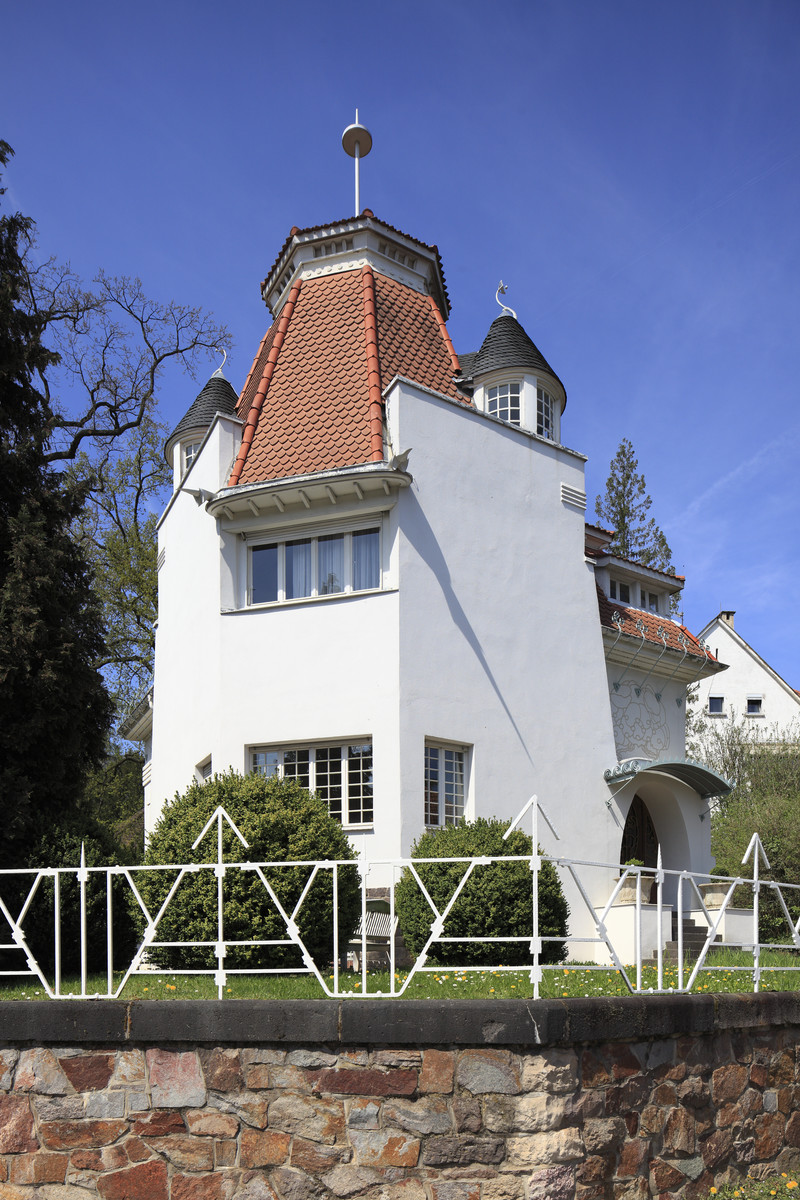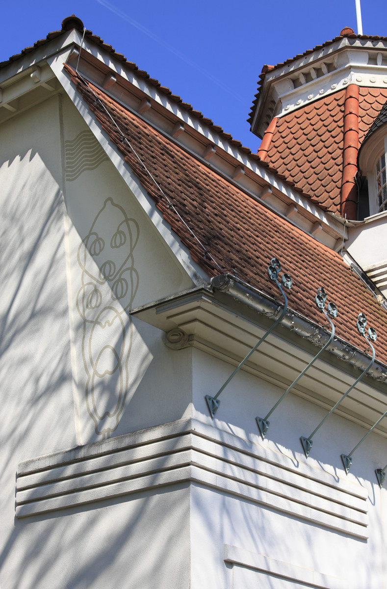 The form and orientation of the building respond to the location at the corner of two streets. This is particularly noticeable in the three-sided structure facing the corner. It has large white wall surfaces and continues upwards in a hexagonal roof extension with flanking round turrets. The playful roof shapes, including the plane tiles and the two symmetrically placed turrets, are still reminiscent of the English country house type, while the smooth white wall surfaces in the south and east refer to the clarity of modernity.
