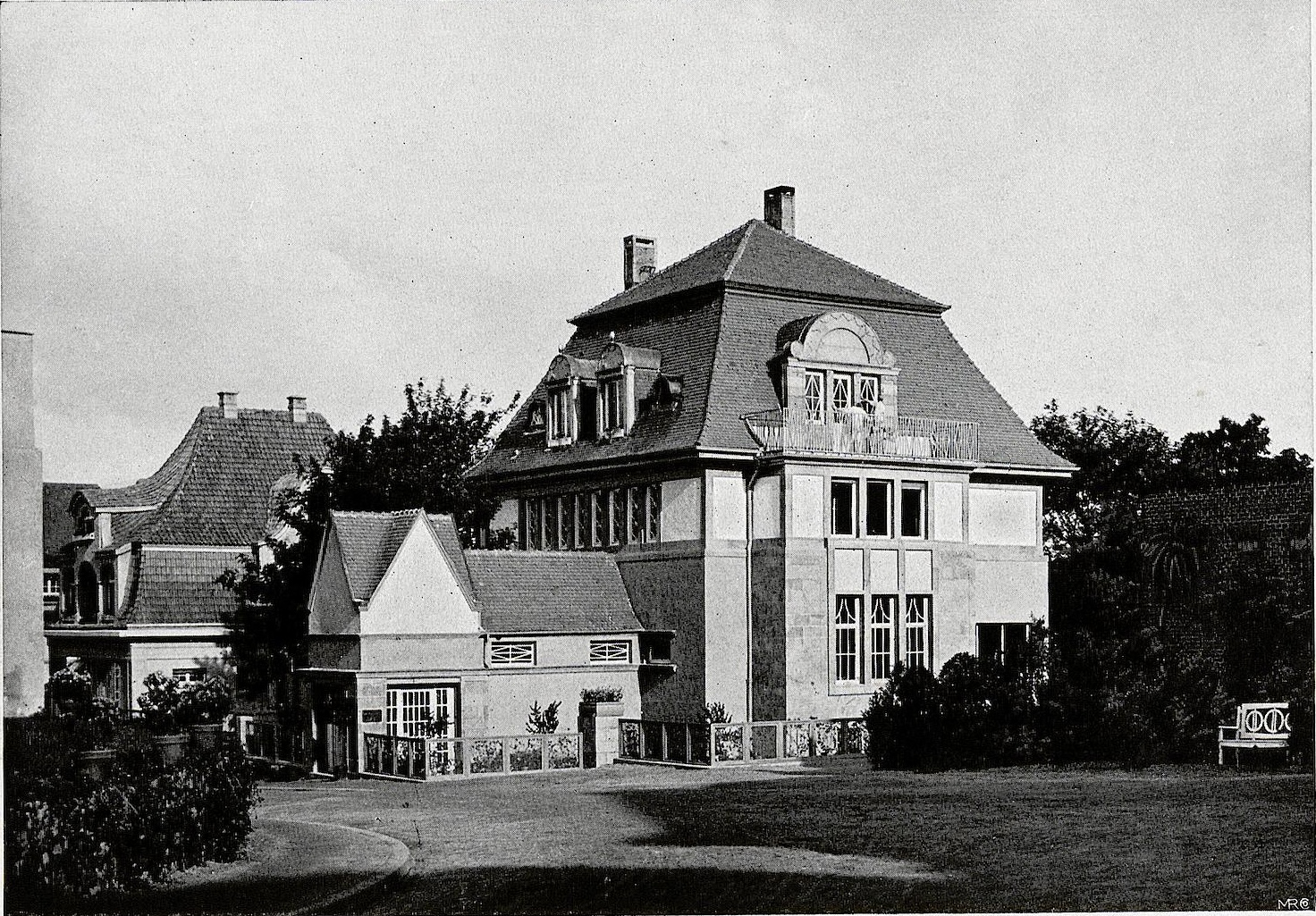 Instead of the originally planned architecture based on regional traditions, Olbrich designed a functional cube characterised by light-grey surfaces and pilaster strips of Upper Hessian basalt lava. In addition, with a loggia facing south Olbrich combined elements of the Italian Renaissance and a block-like, clear construction. Through the open loggia one enters the garden, in which a small garden house with interior decoration designed by Jacob Krug has been preserved. The mansard hipped roof provides space for spacious attic rooms with large dormers. A porch reaching to the street served as entrance. It was not restored after war damages.